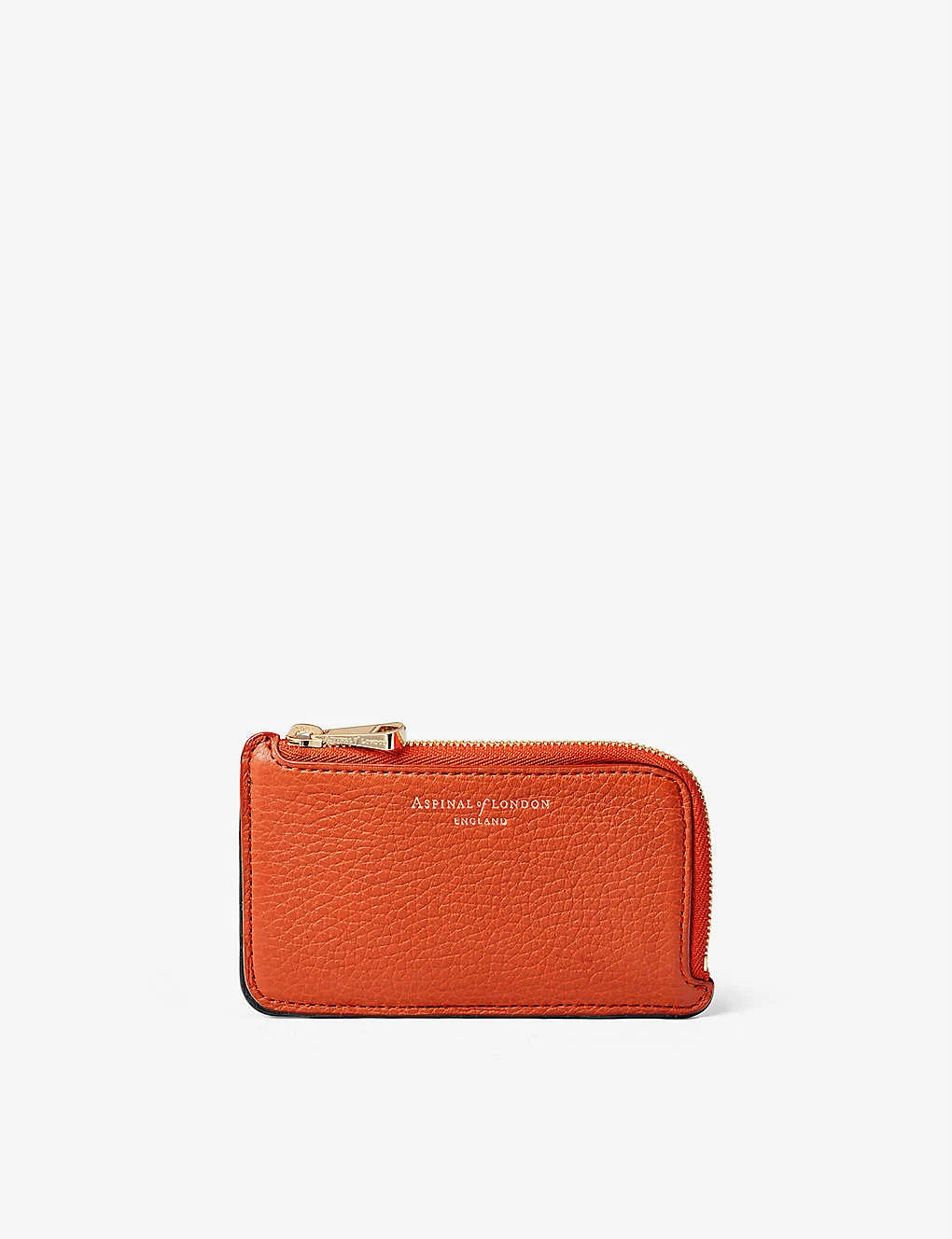 - Three card slots, zipped coin pocket, gold logo, signature branded zip pull, grosgrain lining